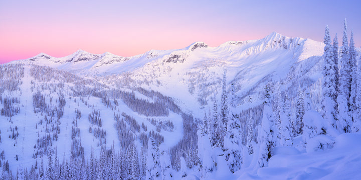 Alpenglow skies over Whitewater Ski area with the Raven Chairlift on the left and Ymir Peak on the right. Nelson, BC, Canada. Photo by Lucas Jmieff.